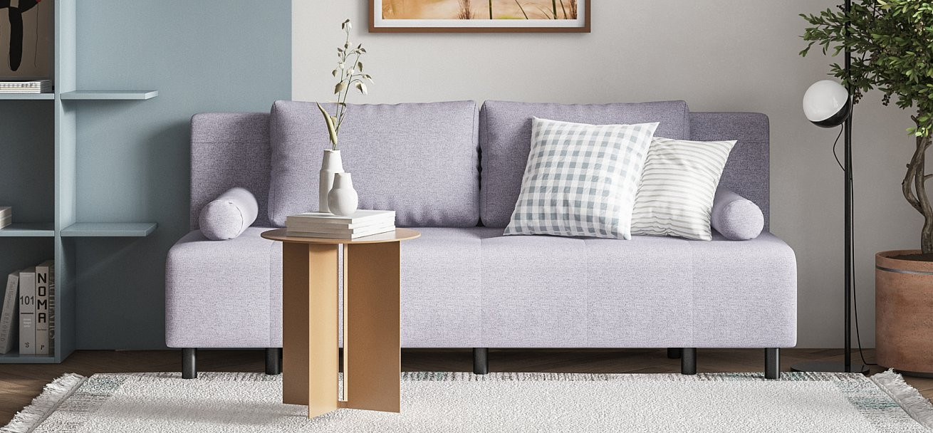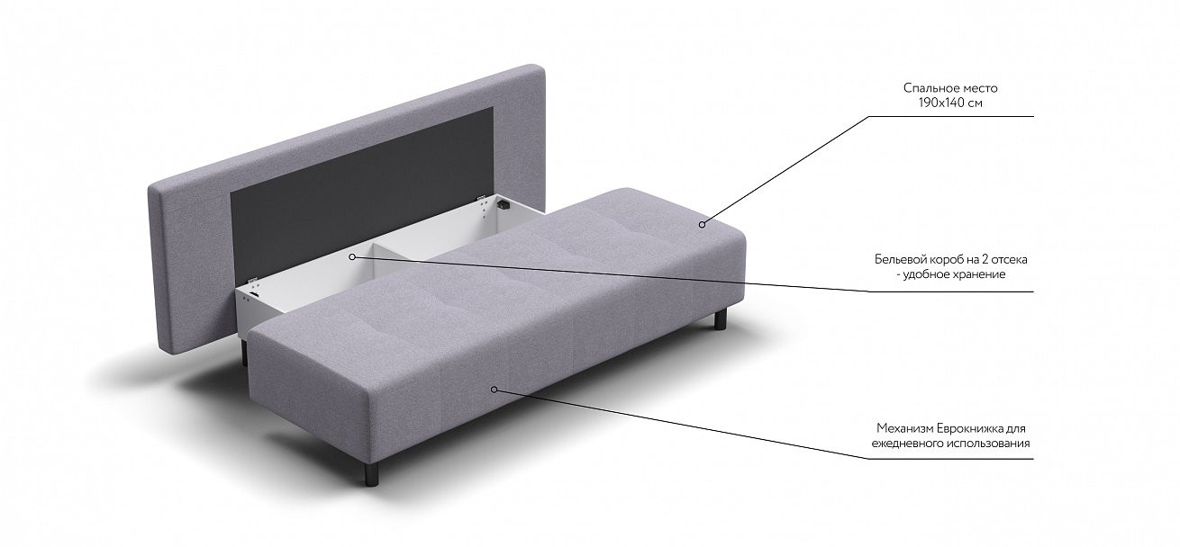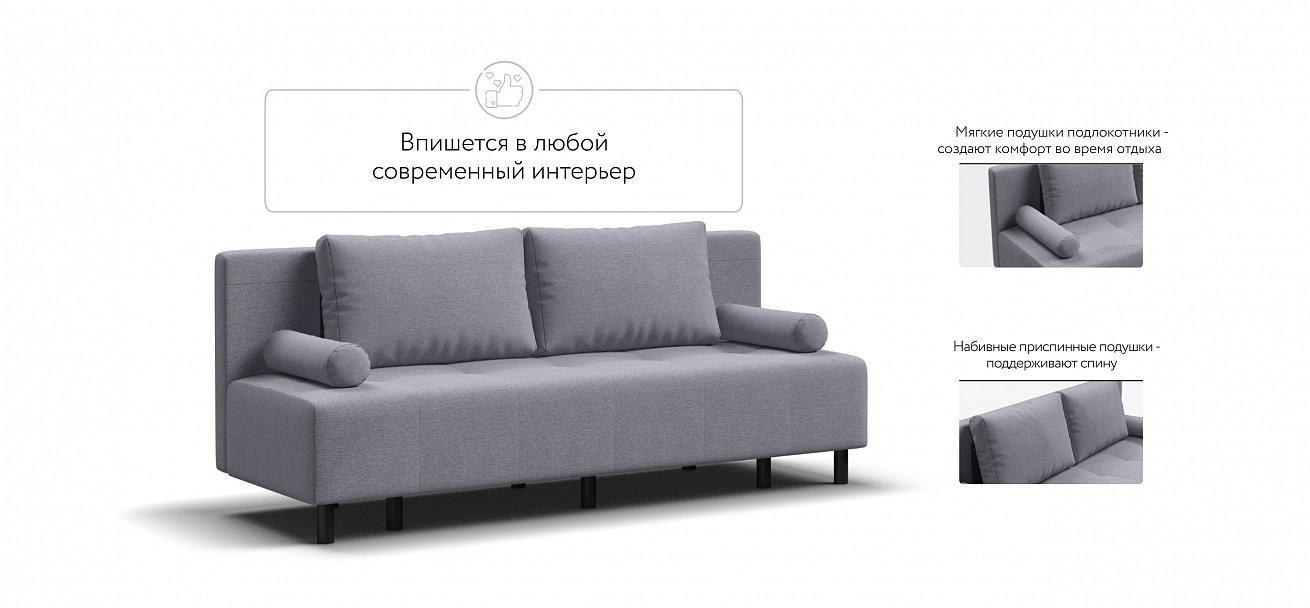 Модель оснащена надёжным механизмом трансформации еврокнижка, который за пару движений превращает диван в полноценное спальное место. Дополнительные декоративные подушки в комплекте добавляют мягкости и завершают образ.