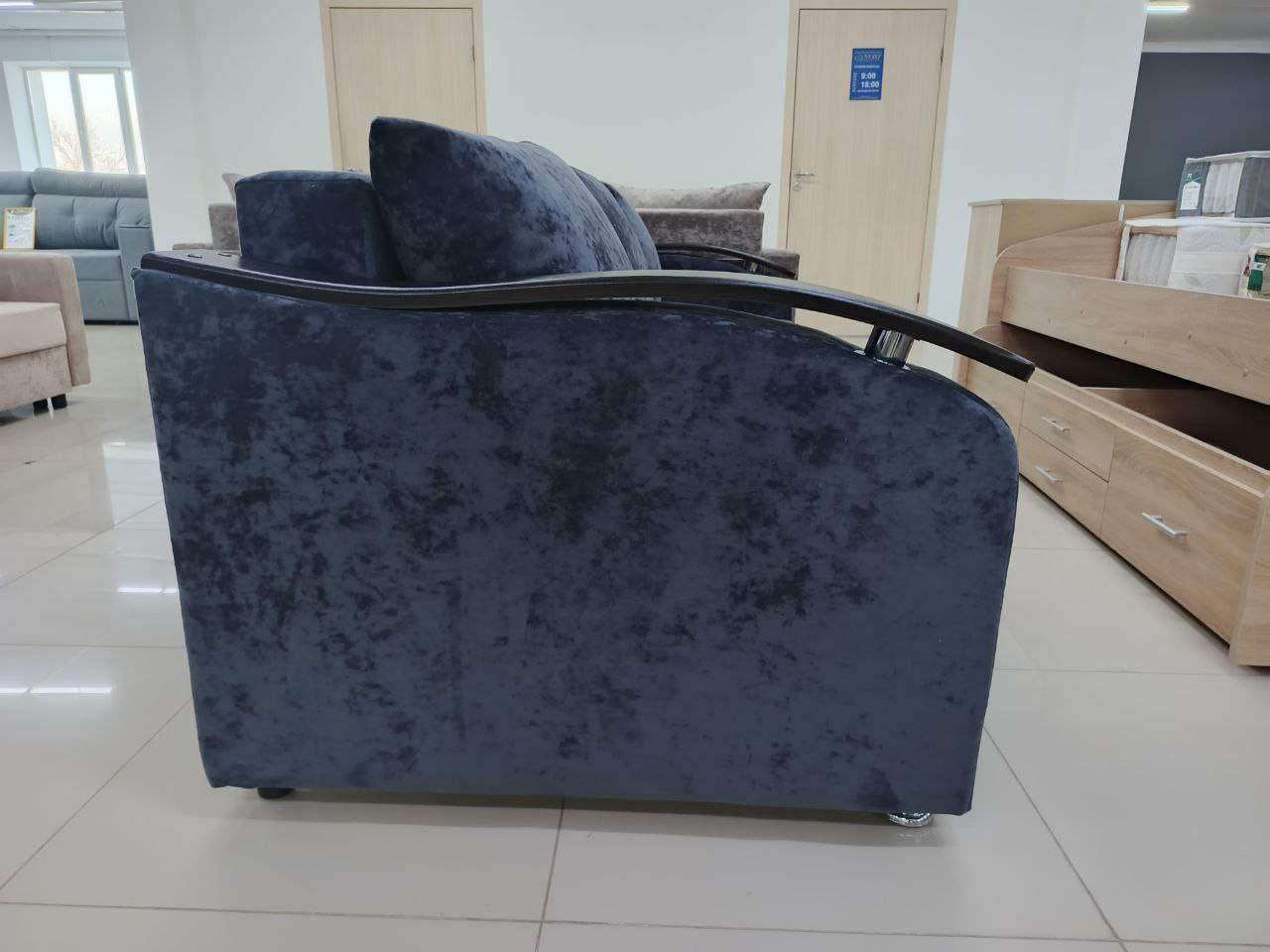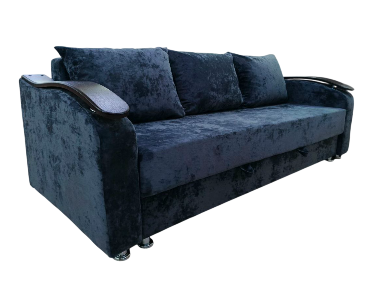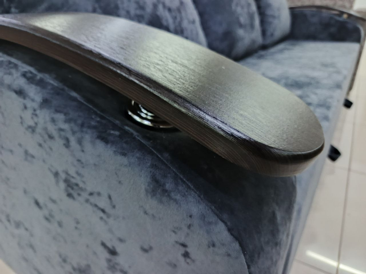 Обивка из плюша приятна на ощупь и долговечна, а подлокотники из МДФ добавляют модели элегантности.