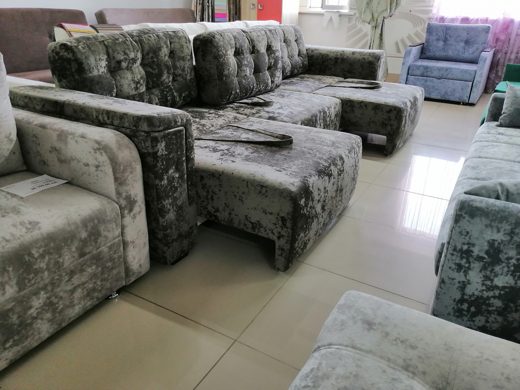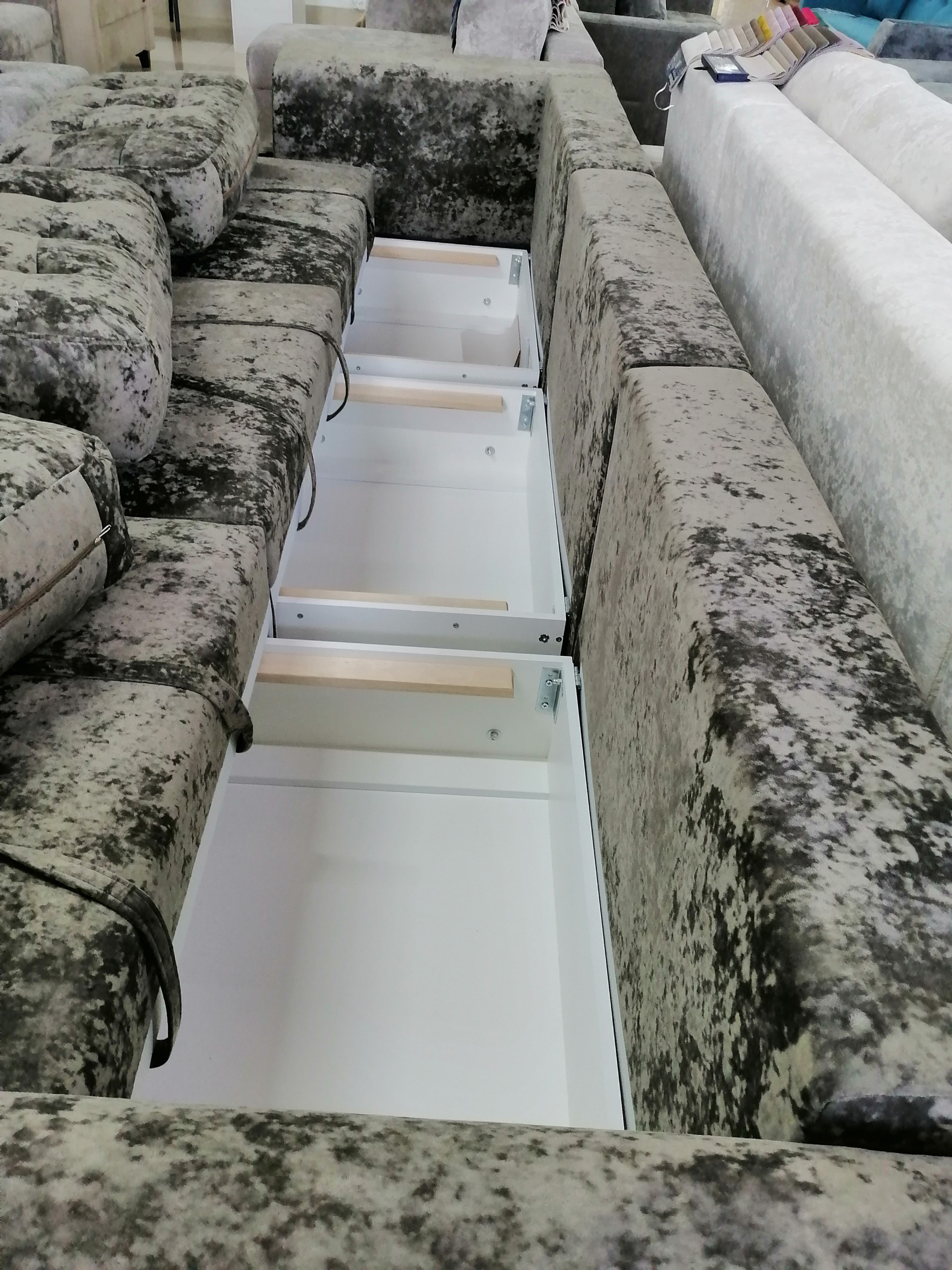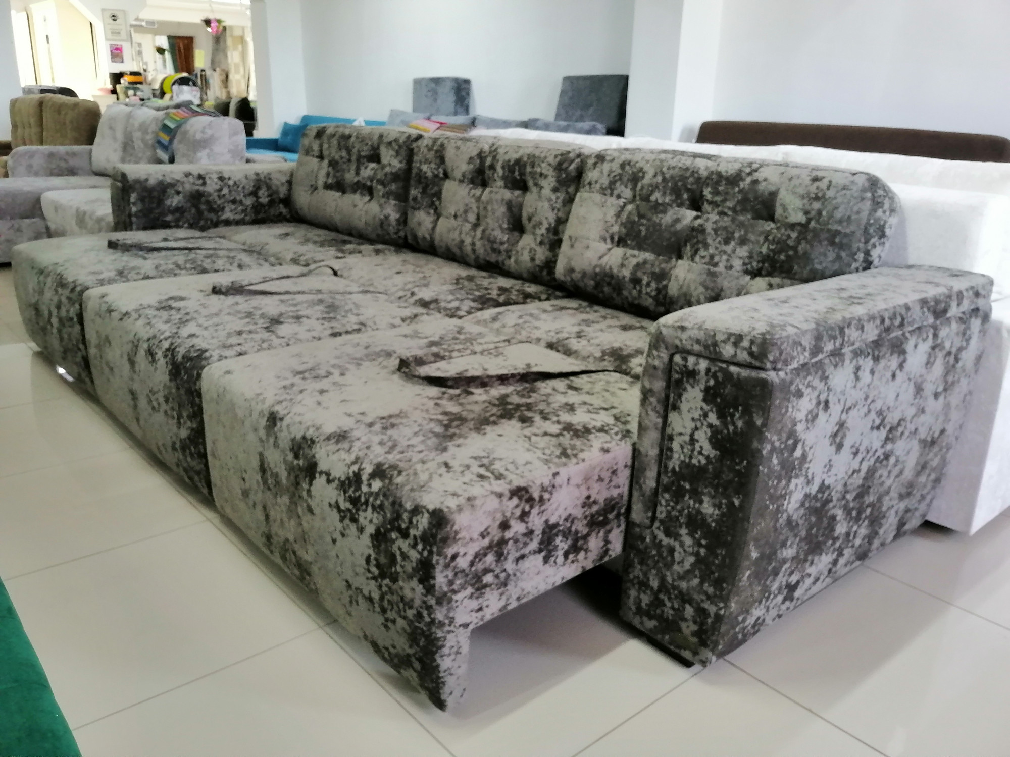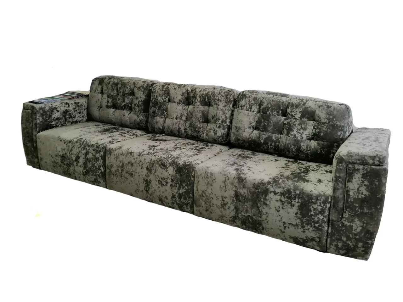 Ткань плюш устойчивого качества дарит мягкость и нежность; три ящика под сиденьем; механизм раскладки плавный и бесшумный, декор подушки завершают образ домашнего рая.
