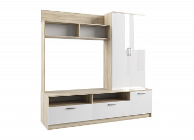 Стильная стенка для гостиной "Софи", выполненная в светлом оттенке Дуб сонома с фасадами Белый глянец, идеально впишется в интерьер вашей комнаты. Отлично сочетается с другими модулями из серии "Софи".