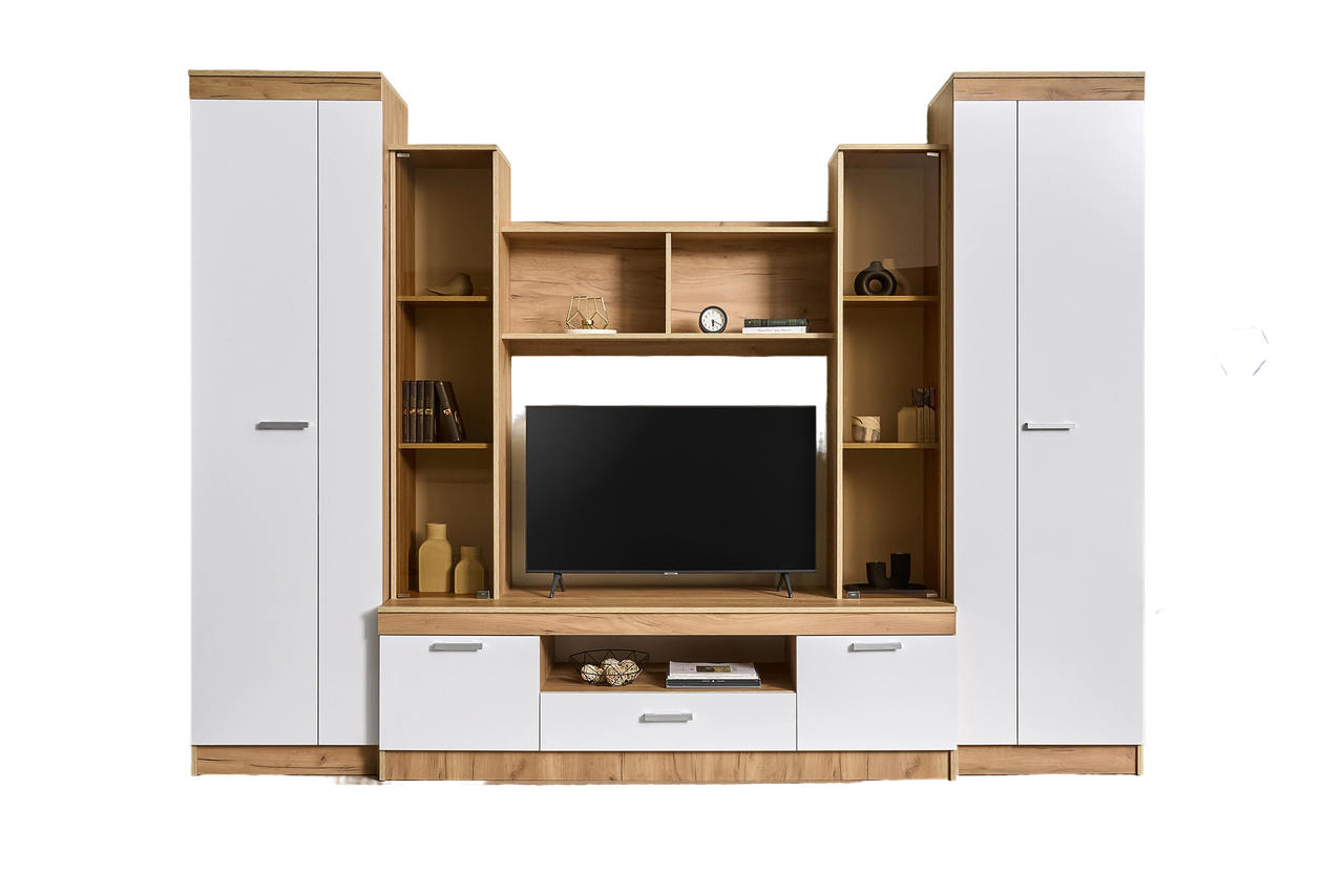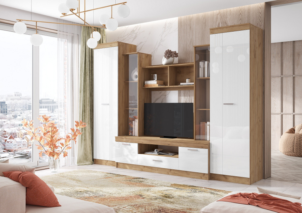 Гостиная АТЛАНТИДА-6 дуб крафт золотой/белый глянец 300х60х222