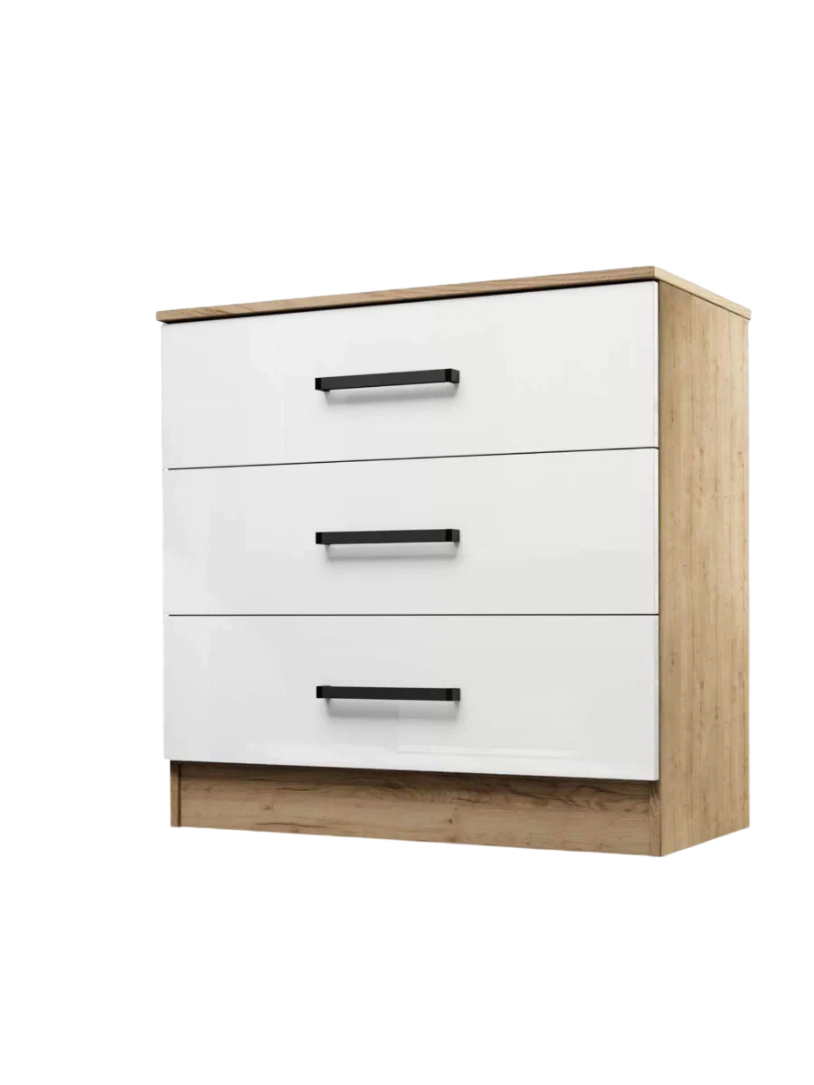 Комод оснащен тремя ящиками, что позволяет удобно разместить все необходимые вещи. Пластиковые ручки и роликовые направляющие обеспечивают простоту и надежность использования.