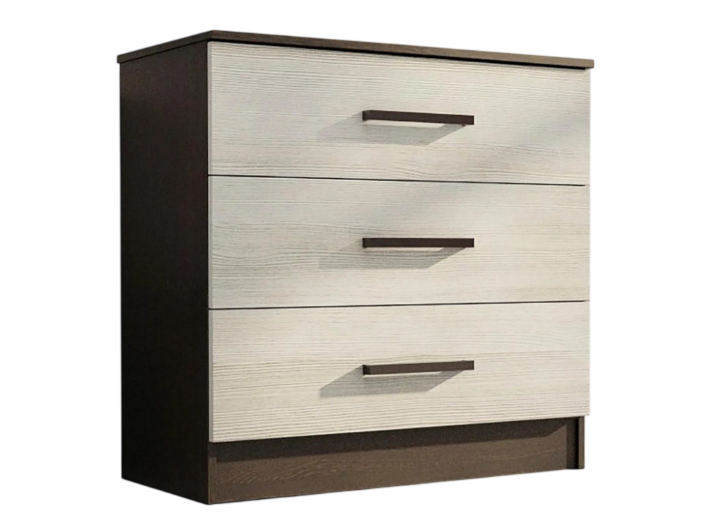 Комод оснащен тремя ящиками, что позволяет удобно разместить все необходимые вещи. Пластиковые ручки и роликовые направляющие обеспечивают простоту и надежность использования.
