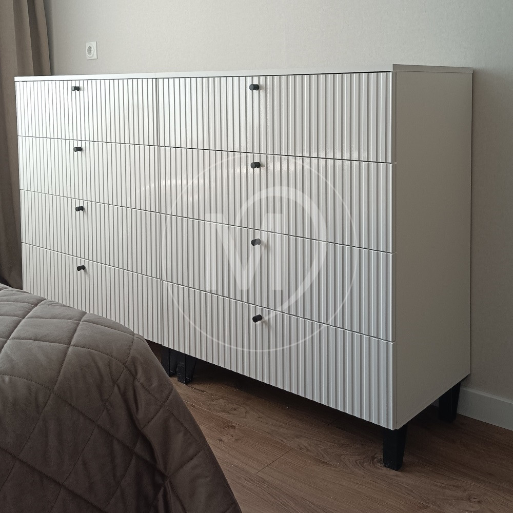 Рифленые фасады стали настоящим трендом в дизайне интерьера. Фрезеровка в виде вертикальных полос добавляет изделию изюминку, не перегружая его лишними деталями.