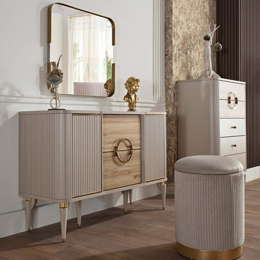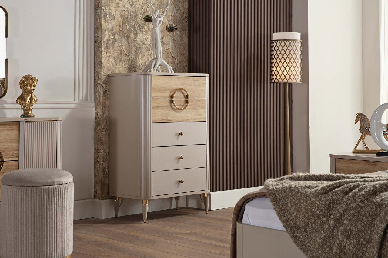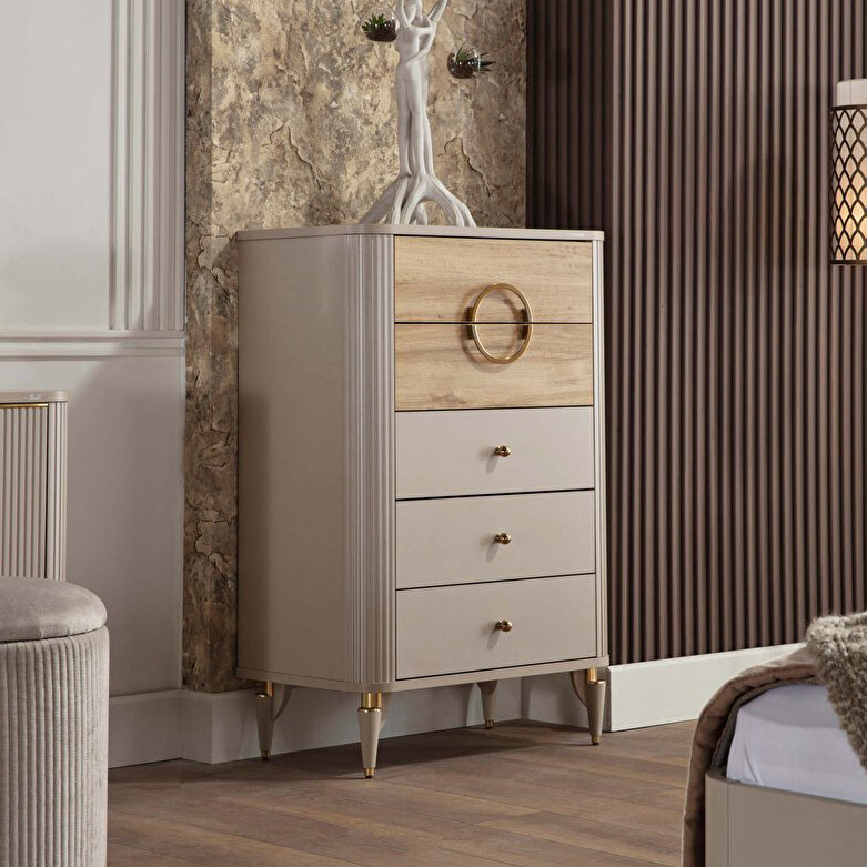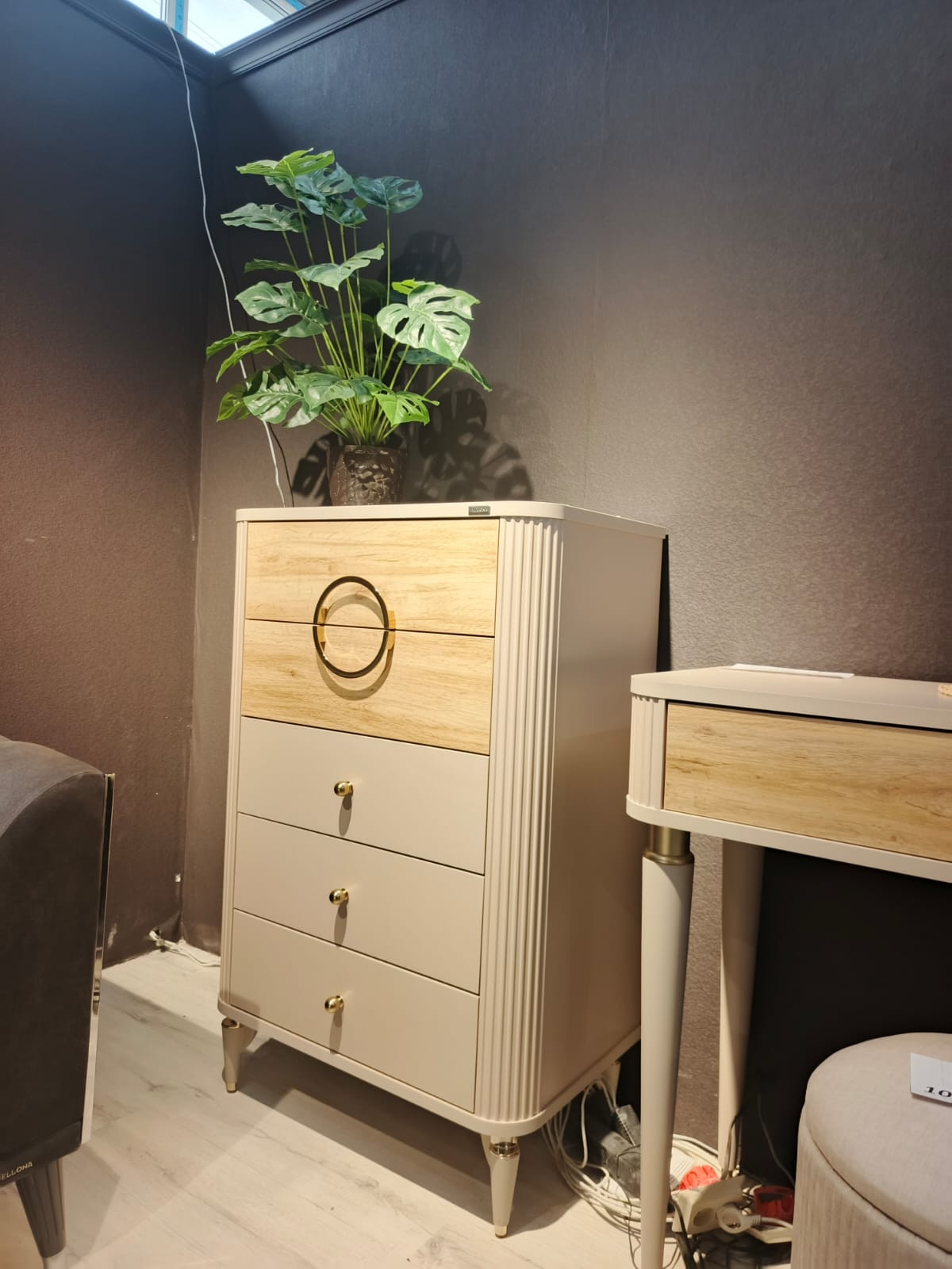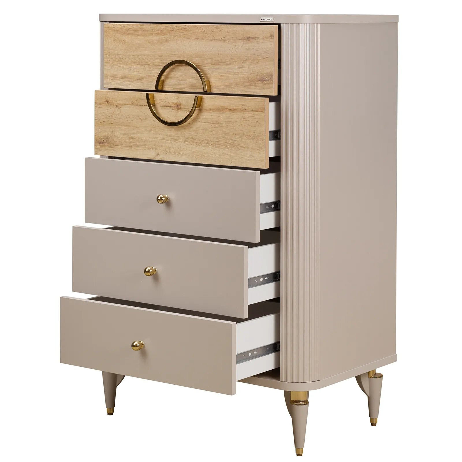 Высокий комод Bellona Sanvito SANV-28 - это элегантный и стильный предмет мебели, который станет отличным дополнением к вашей спальне или другой комнате. Выполнен в современном стиле с использованием высококачественных материалов турецкого производства. Основной цвет комода - бежевый / кремовый, с вставками цвета дуба, которые добавляют ему дополнительную изысканность. Пять выдвижных ящиков для хранения позволяют хранить и постельное бельё, и одежду, и другие вещи. Компактный размер и функциональность этого комода делают его идеальным решением для небольших комнат, где каждый квадратный метр имеет значение.