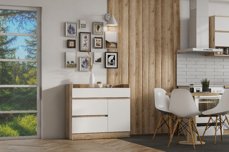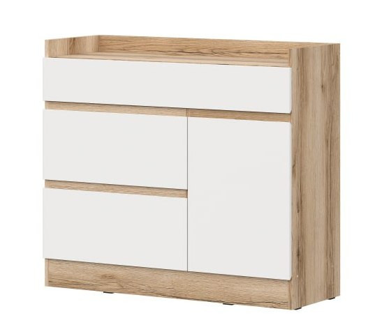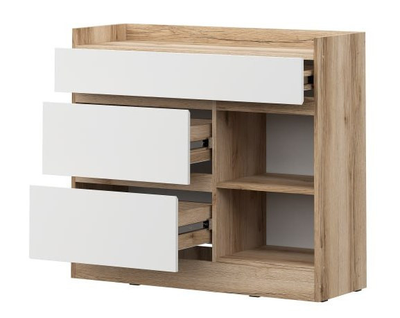 Комод оборудован тремя выкатными ящиками на шариковых направляющих полного движения. Уникальный конструктив комода заключается в том, что помимо древесных линий, встречных скосах между верхним ящиком и средним ящиком, борта боковин и задней стенки комода подняты. Комод подходит как для спальни, гостиной, прихожей, так и для детской.