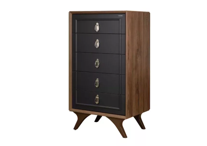 Комод высокий Alegro от фабрики Bellona. Коллекция Alegro (Алегро) выполнена в современном классическом стиле с использованием контрастных цветов ореха и антрацита. Ножки коллекции выполнены из массива, петли мягкого закрывания, а ящики буфета на телескопических направляющих. Высокий комод Alegro с 5 ящиками можно установить даже в спальне не большой площади.