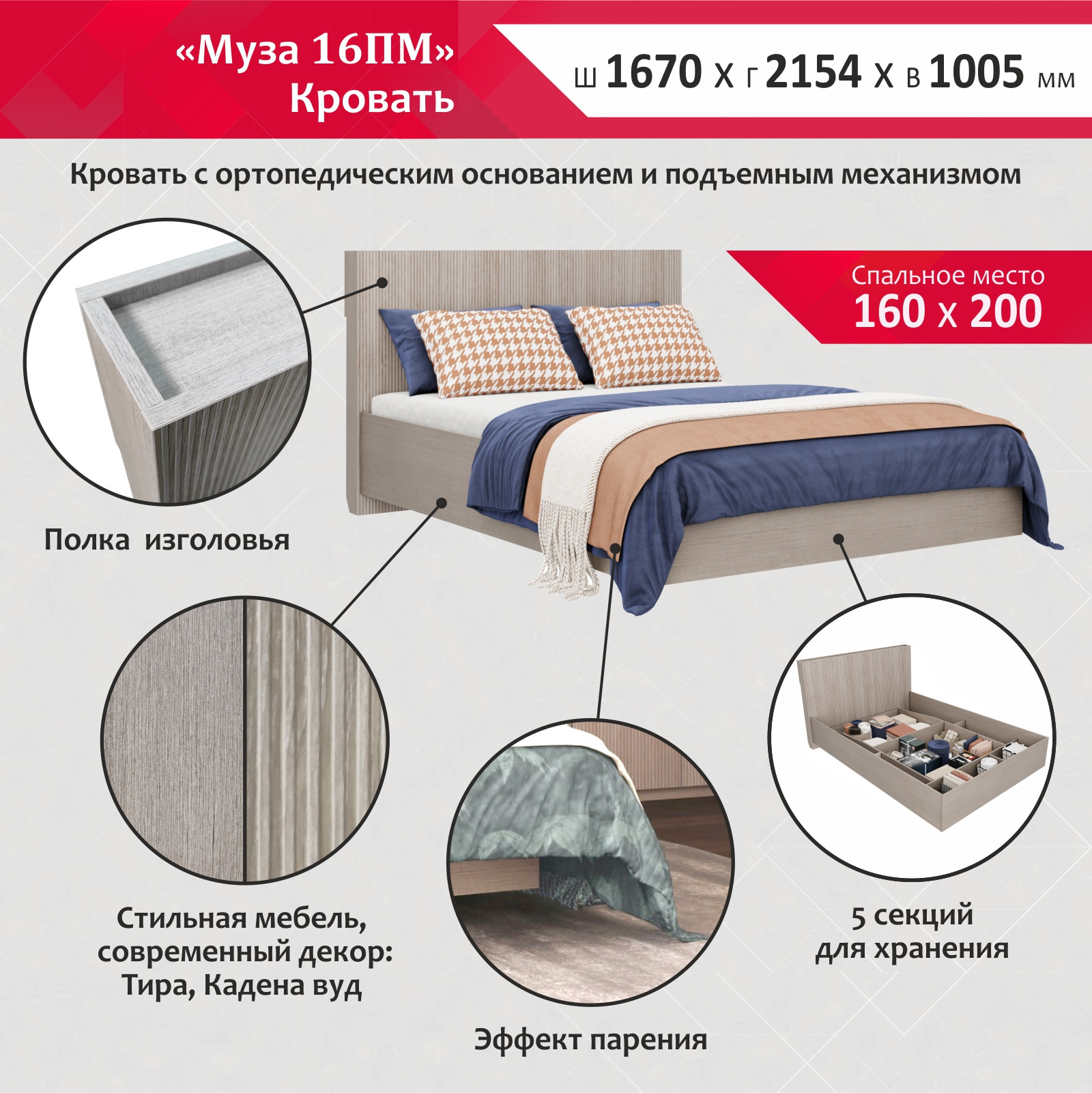 - Особенности изделия: Эффект парения. Есть секции для хранения – 4 шт. Рекомендуемая высота матраса 20-25 см (приобретается дополнительно)
