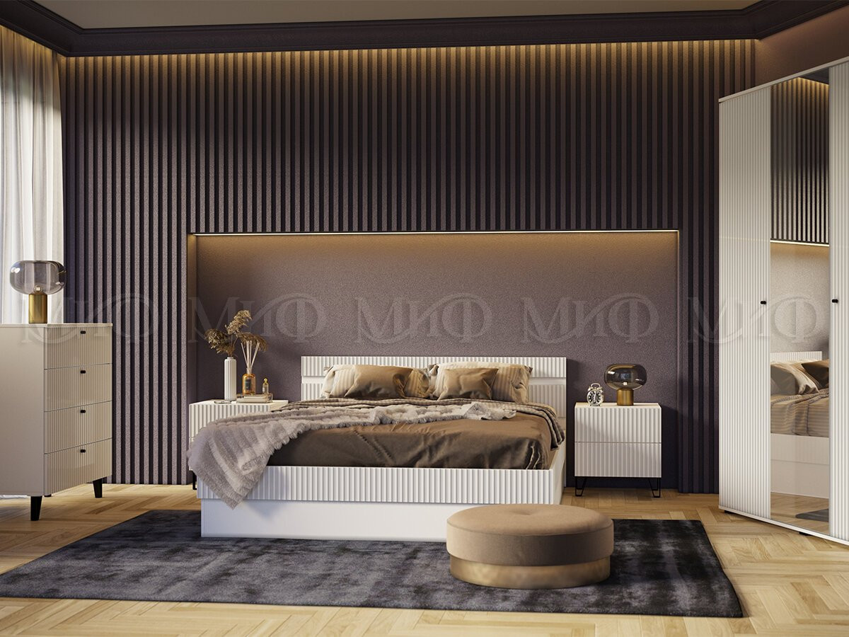 Кровать "Оливия" имеет ортопедическое основание с подъемным механизмом, под которым располагается вместительный ящик для хранения постельного белья или других вещей. Изголовье и царги кровати декорированы рифлеными вставками.