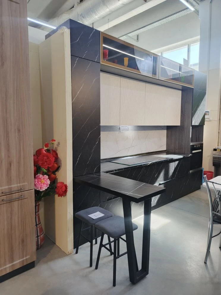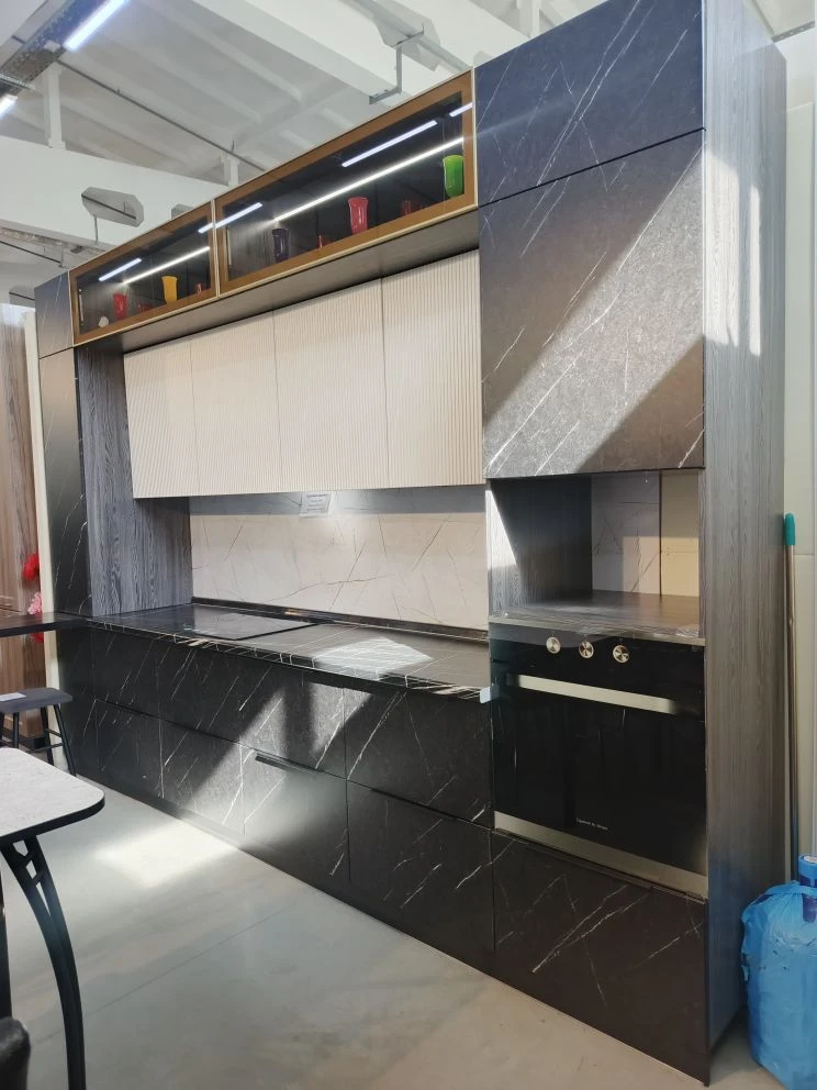 - Нижние шкафы: отделка под чёрный мрамор — подчёркивает статусность пространства, придаёт кухне роскошный вид, устойчива к повседневным нагрузкам.