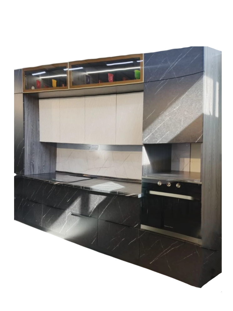 Элегантный кухонный гарнитур, в котором гармонично сочетаются контрастные фактуры и цвета — идеальное решение для тех, кто ценит стиль и функциональность.