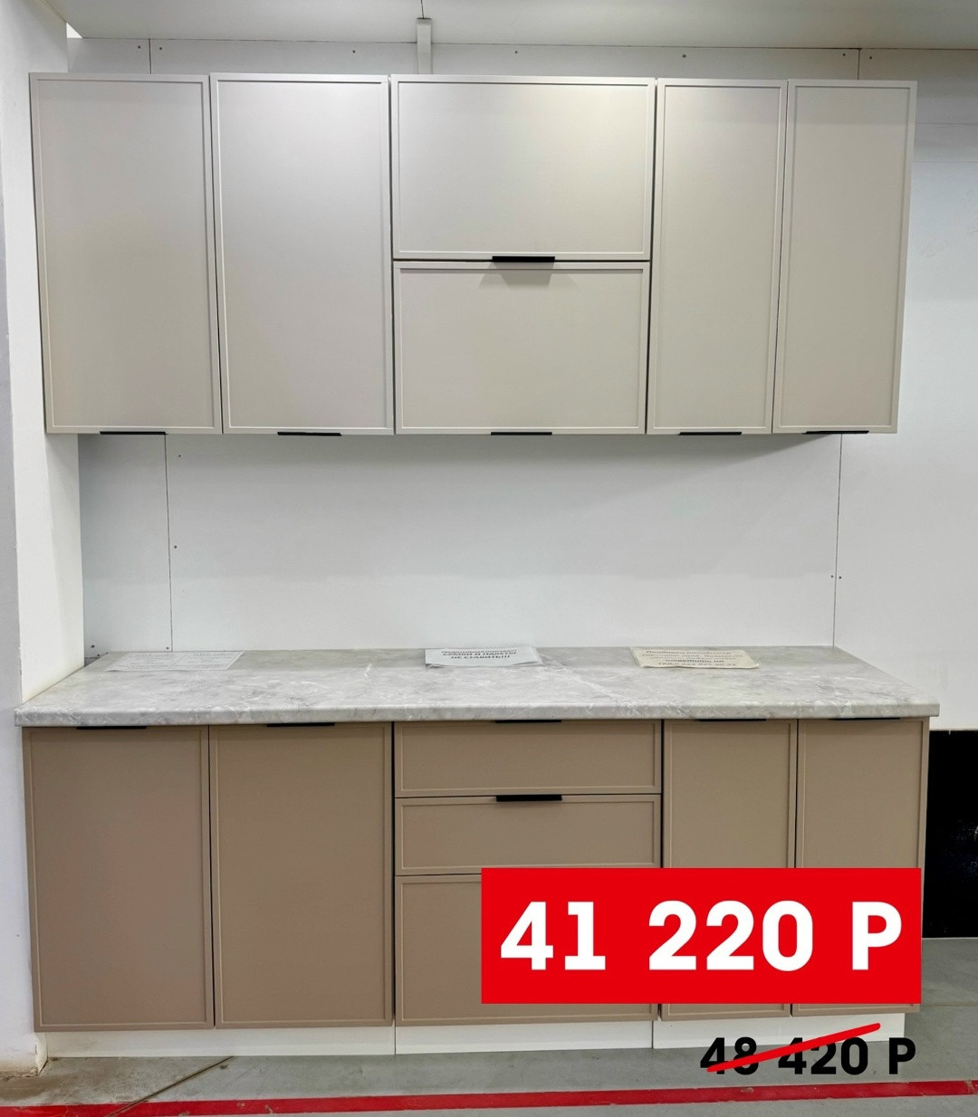 - Конструкция: продуманная планировка с рациональным распределением зон — нижние шкафы для крупной посуды и бытовой техники, верхние — для повседневных предметов и декора.
