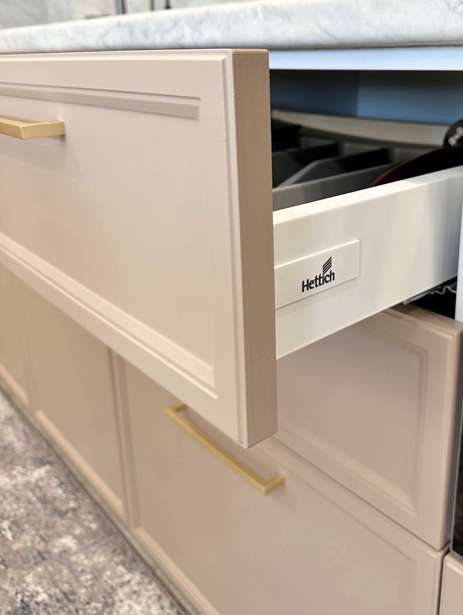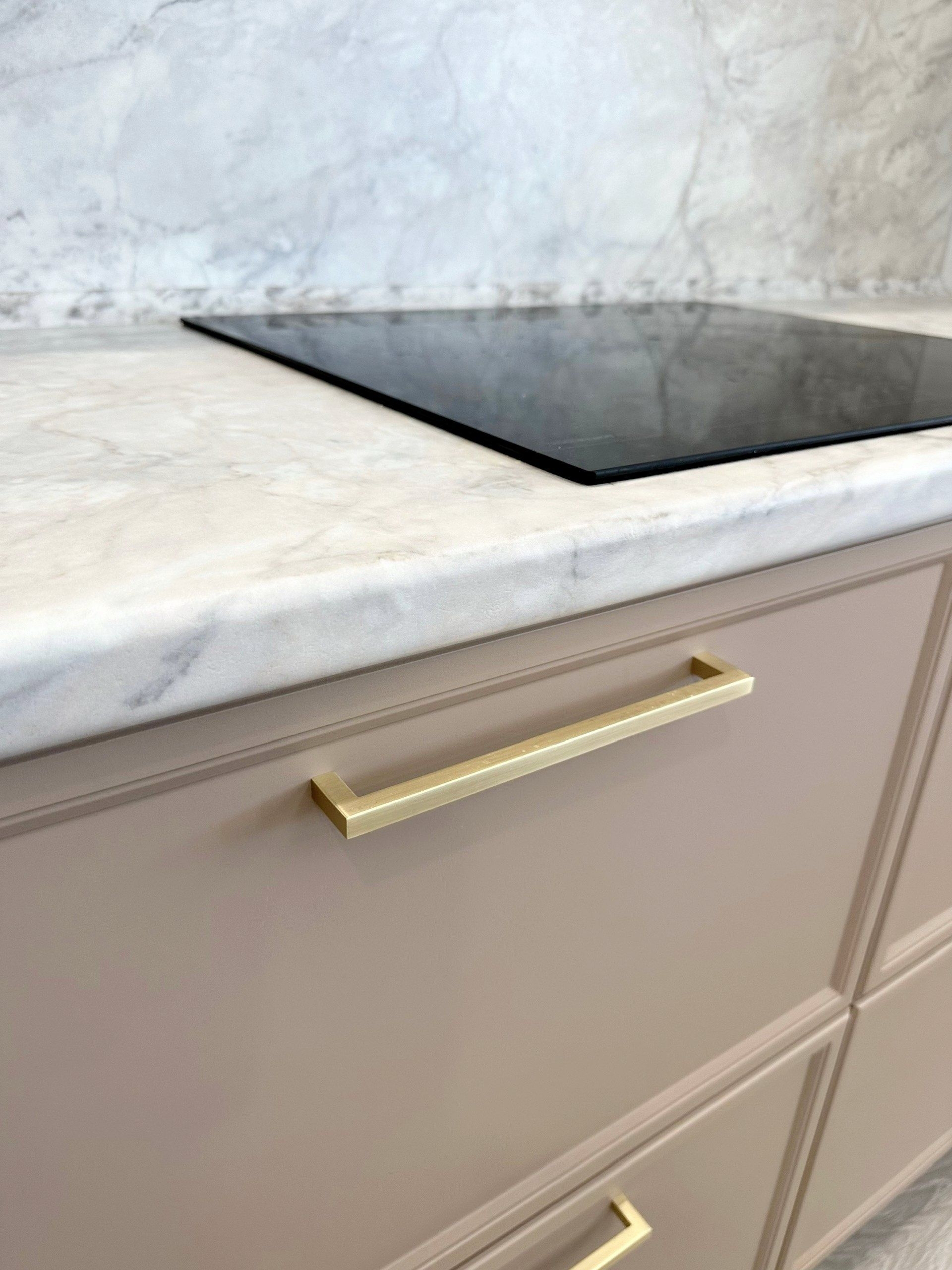 Доборы и цоколи в цвет фасадов помогают замаскировать пространство между мебелью и стеной, чтобы всё выглядело как единое целое.