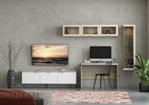 Комплектация включает вместительную ТВ-тумбу на ножках, навесные шкафы для хранения книг, аксессуаров и декора, а также высокий пенал-витрину для посуды или коллекции бокалов. Рабочий стол гармонично вписывается в композицию, создавая удобное место для работы или учебы. Благодаря продуманной системе хранения вы легко разместите всё необходимое, а стеклянные фасады станут акцентным элементом гостиной.