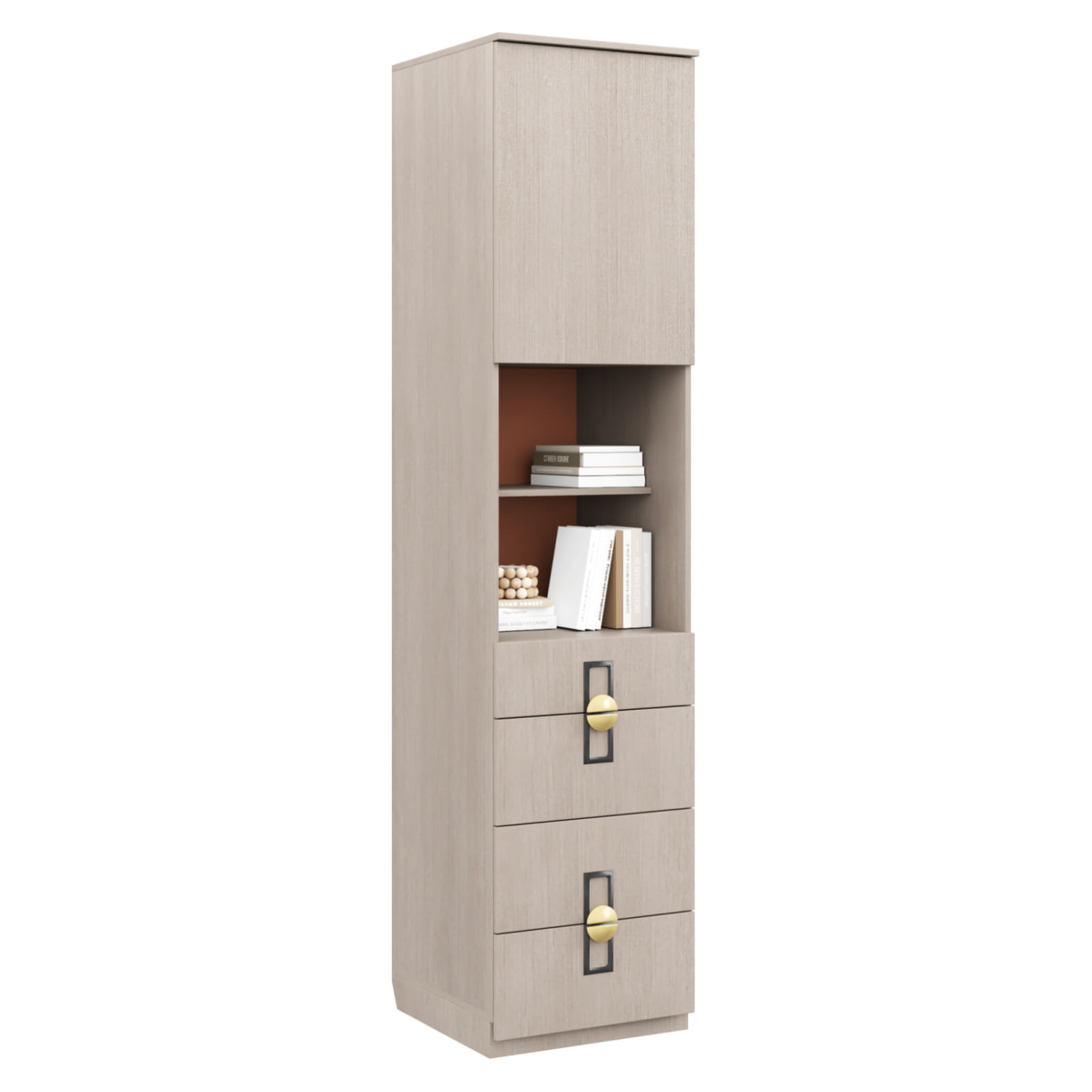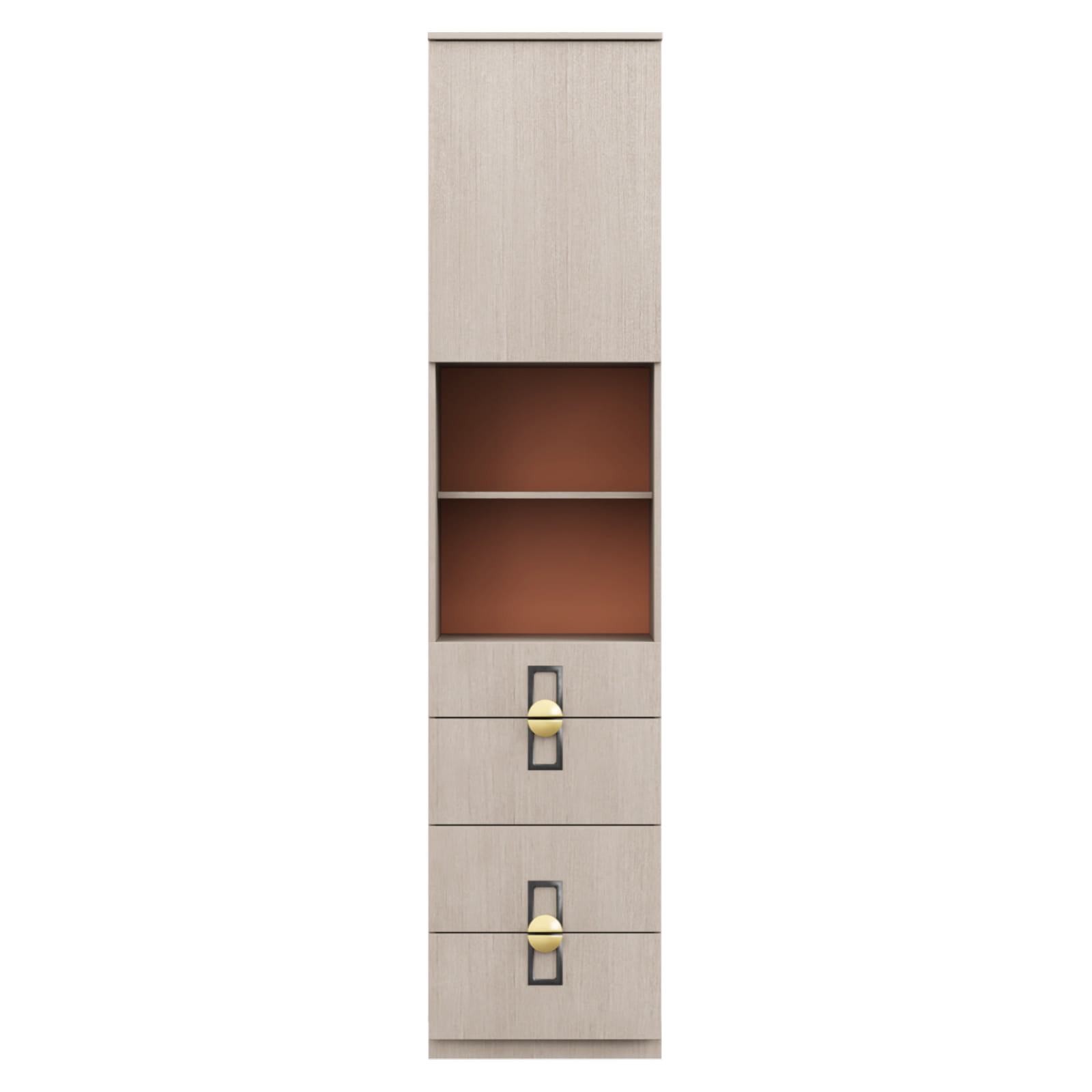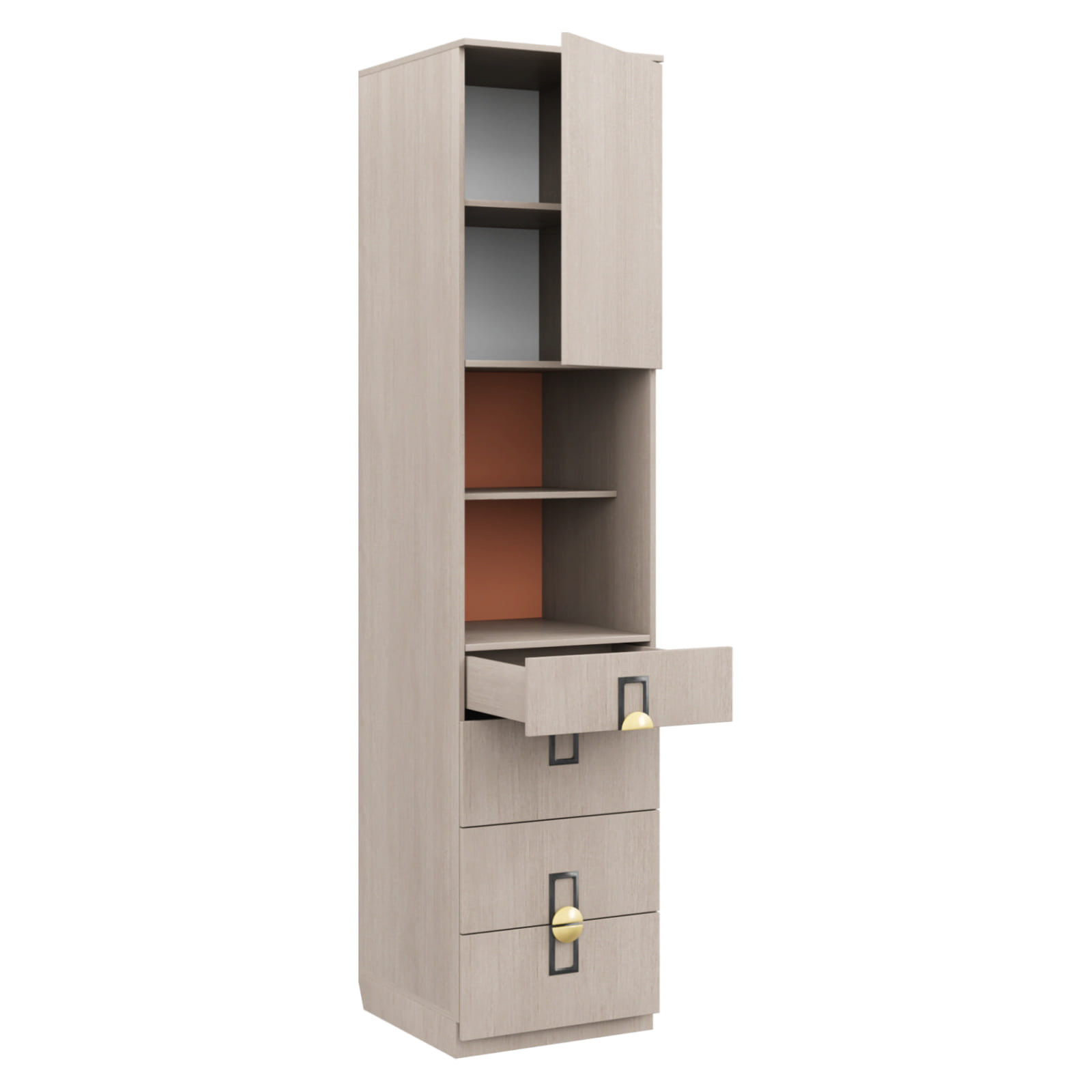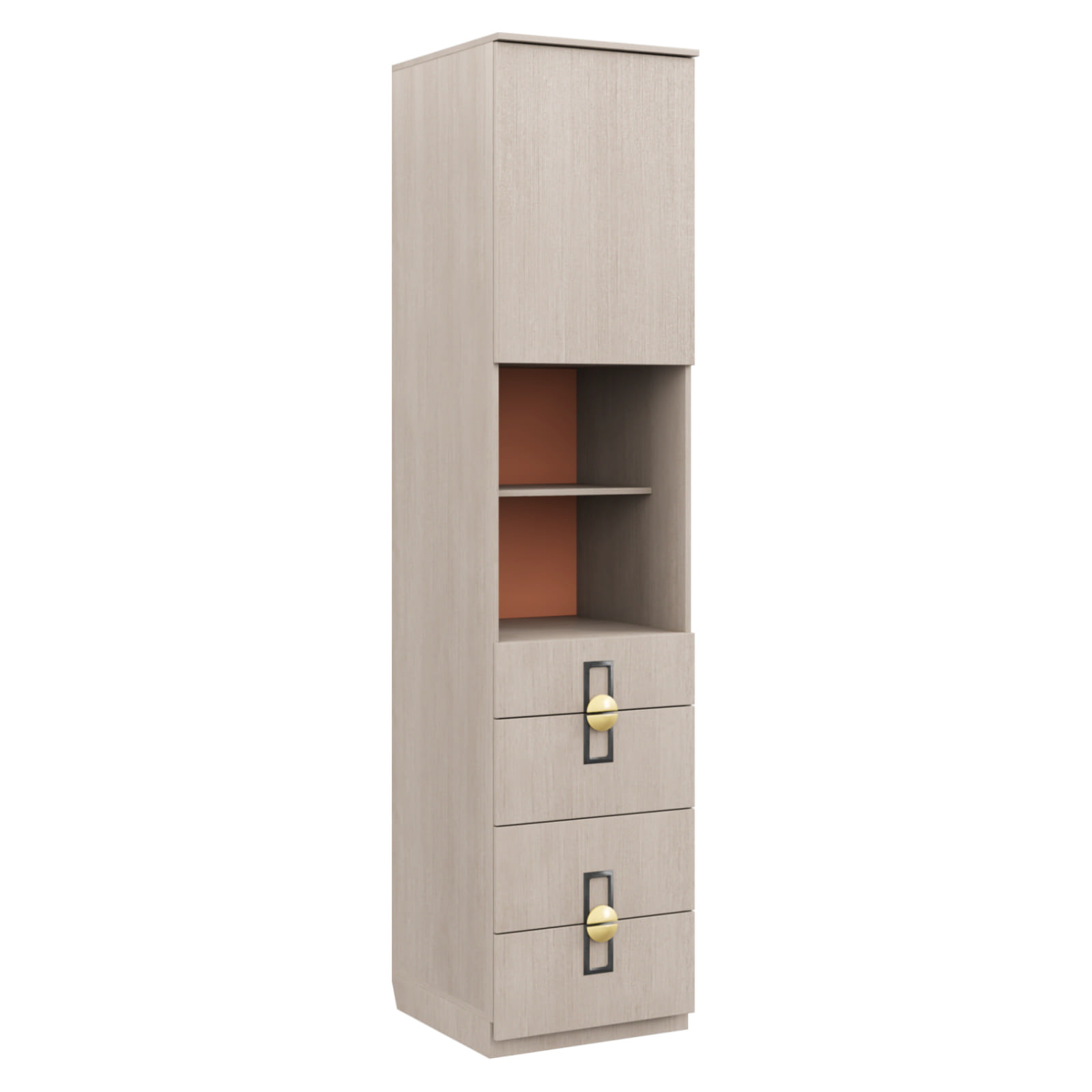 - Особенности изделия: Система открывания для распашной двери Push-to-open (открывается от нажатия на фасад). Составная ручка. Открытая ниша с полками, задняя стенка в цвете Терракота. Выдвижные ящики с доводчиком, дно ящика – ЛДСП 16.