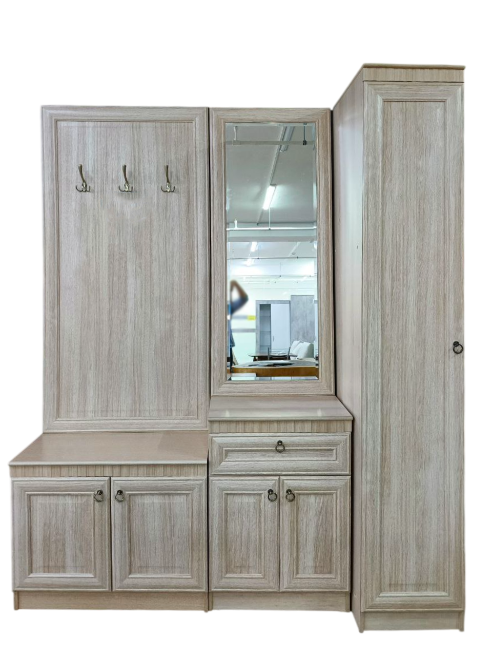 В комплект входит все необходимое входной зоне – распашной пенал для одежды, навесное зеркало, тумба, открытая вешалка и обувница.