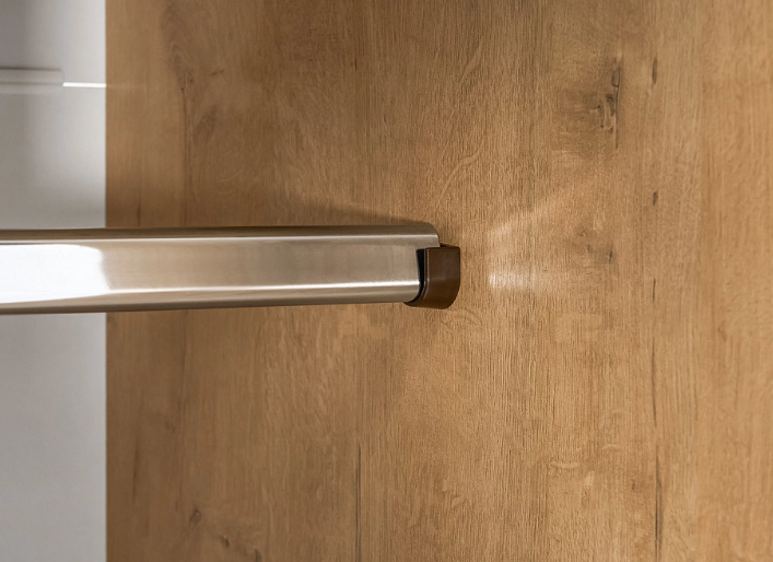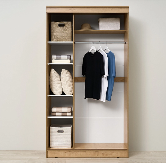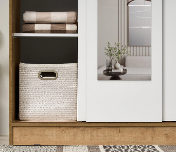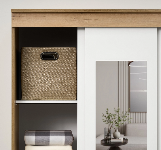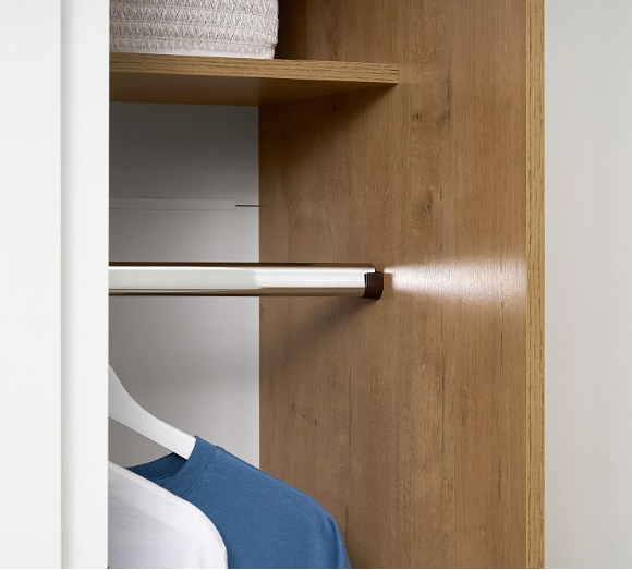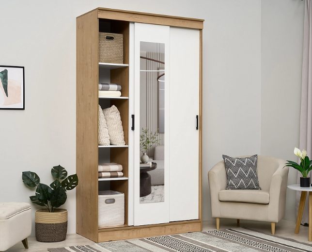 Шкаф-купе Эко оснащен зеркалом, штангой и полками.