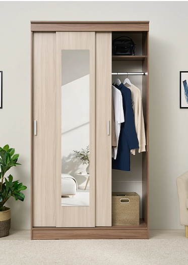 Шкаф-купе Эко оснащен зеркалом, штангой и полками.