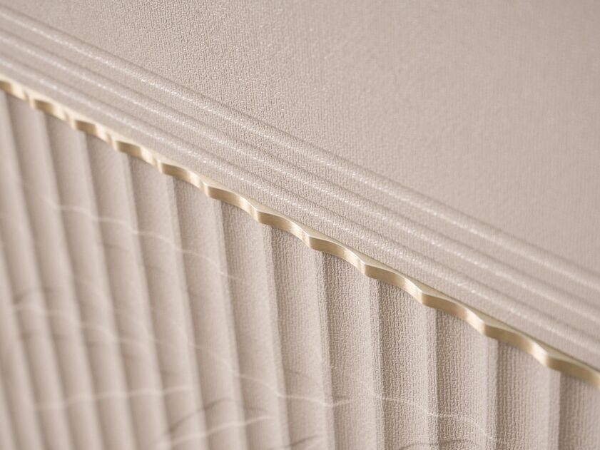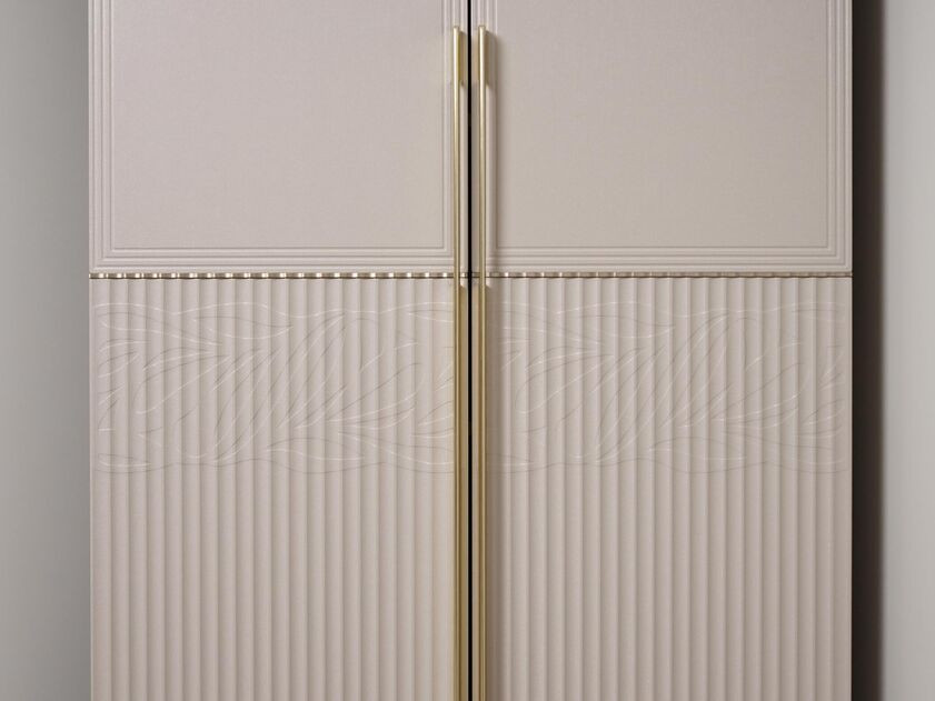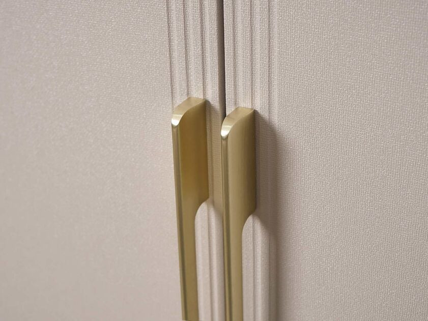 - Металлическая пластина на фасадах толщиной 5 мм проходит обработку по собственной технологии покрытия, которая придает ей изысканный оттенок «сатинового золота». Она гармонично сочетается с цветом фурнитуры и повторяет геометрию вертикальных реек.