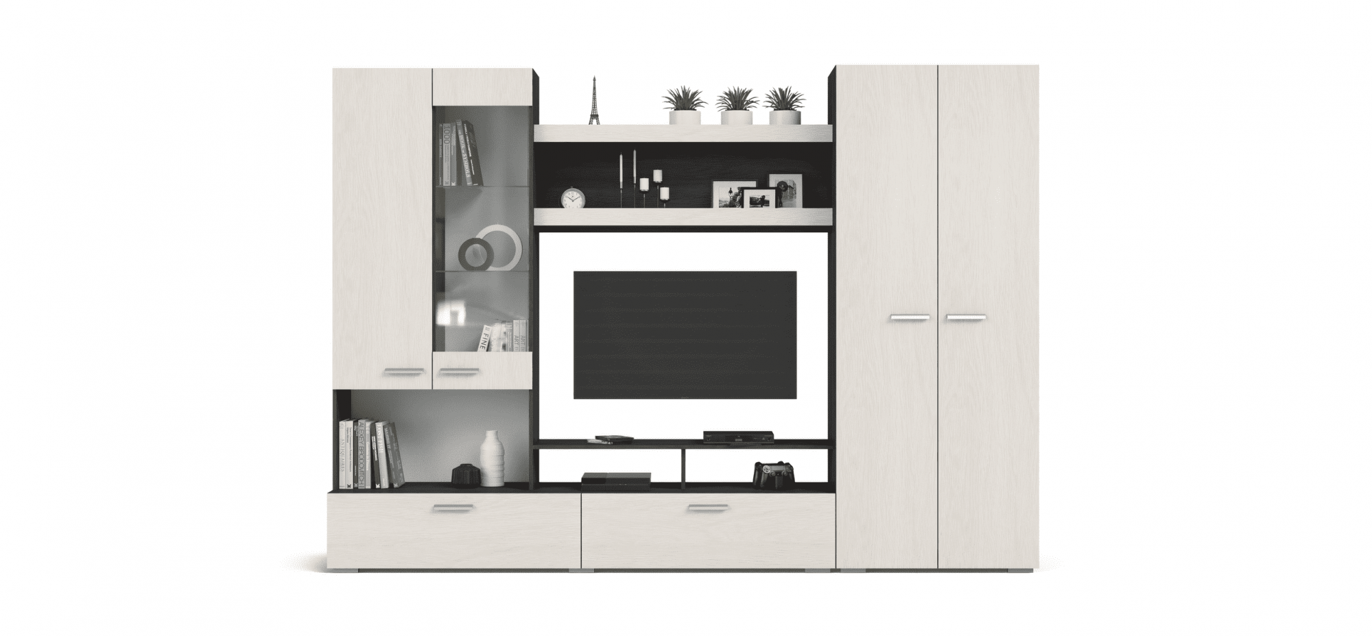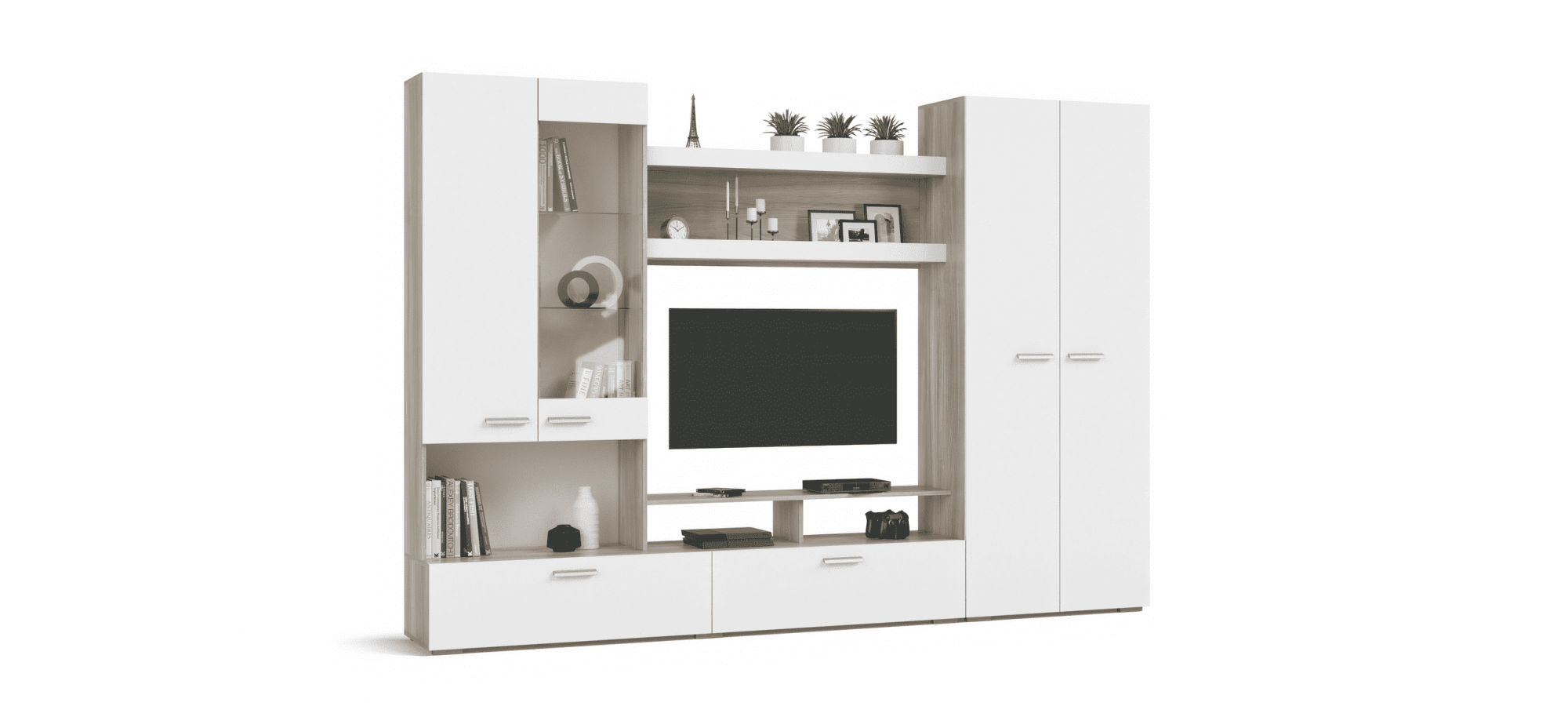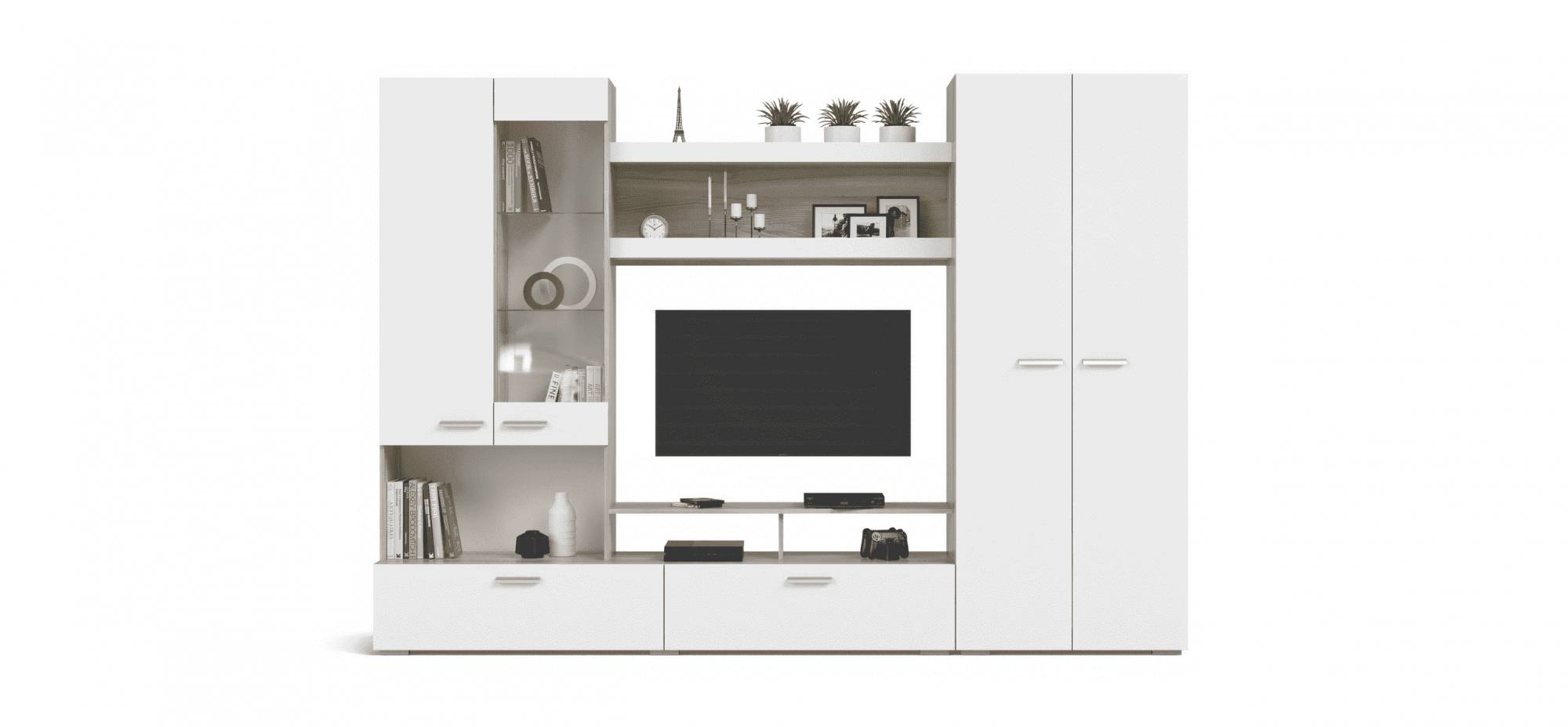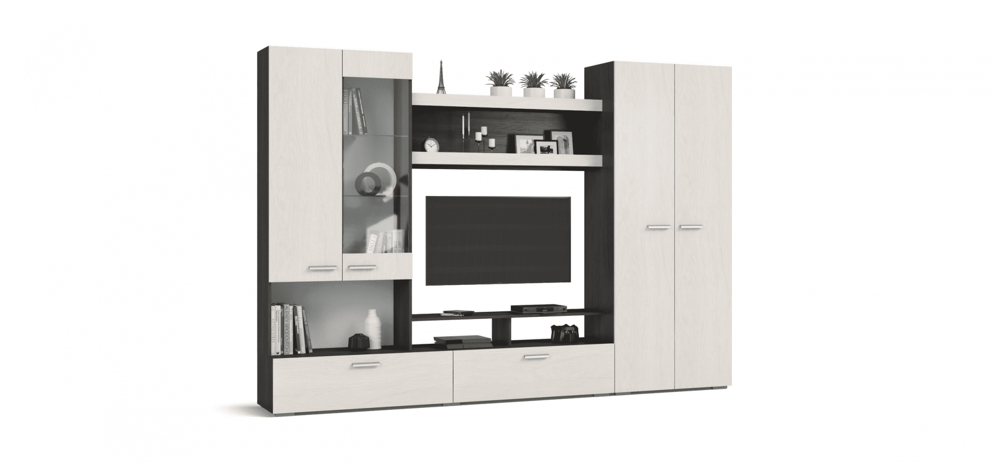 Виго – современная минималистичная стенка, которая сочетает в себе стеклянную витрину со стеклянными полками, откидные ящики, полноценный платяной шкаф с металлической штангой, а также просторную ТВ нишу. Классическое цветовое решение – сочетание двух оттенков привлекает взгляд своим стильным контрастом и делает эту стенку изюминкой в интерьере.