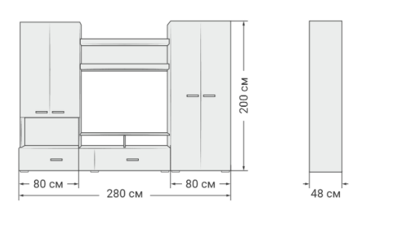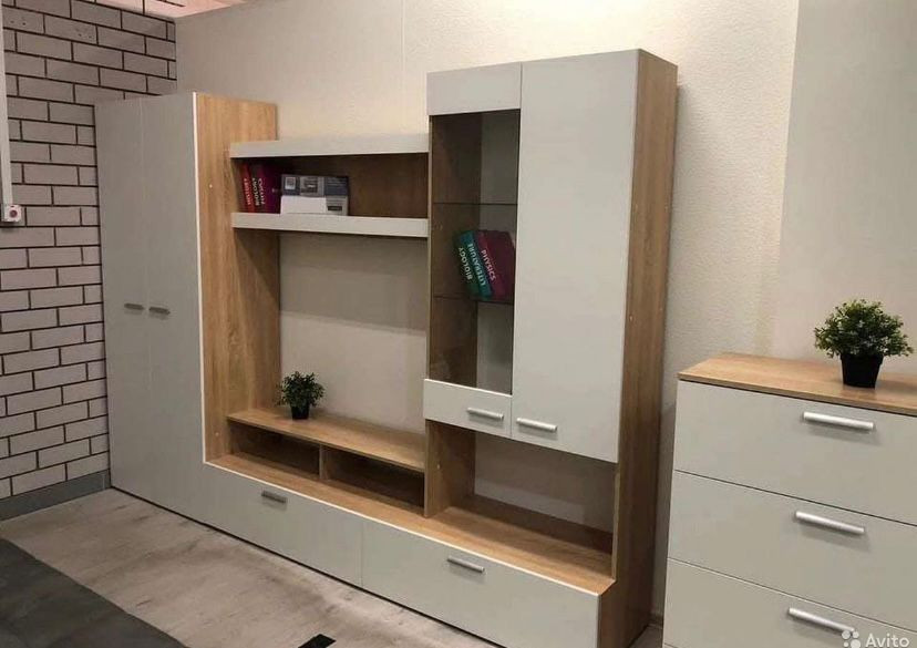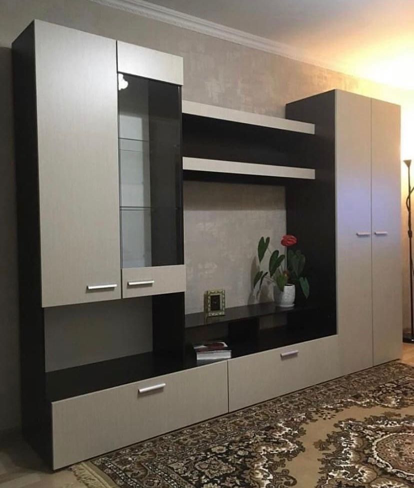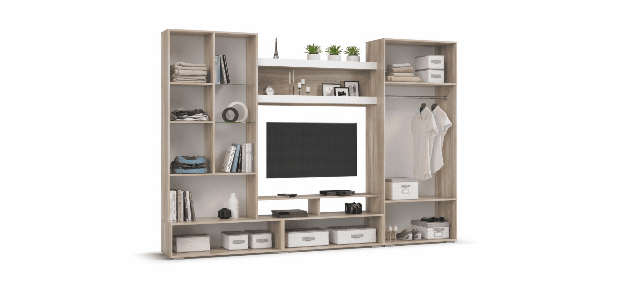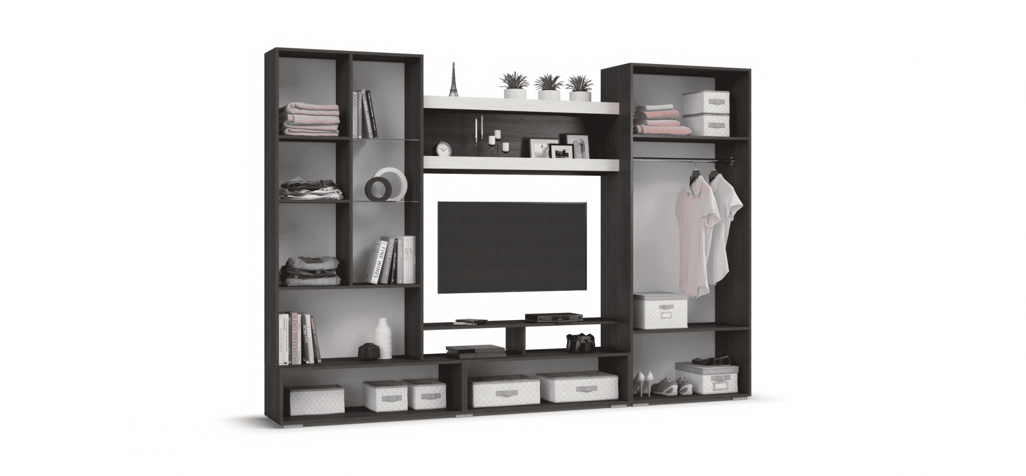 Виго – современная минималистичная стенка, которая сочетает в себе стеклянную витрину со стеклянными полками, откидные ящики, полноценный платяной шкаф с металлической штангой, а также просторную ТВ нишу. Классическое цветовое решение – сочетание двух оттенков привлекает взгляд своим стильным контрастом и делает эту стенку изюминкой в интерьере.