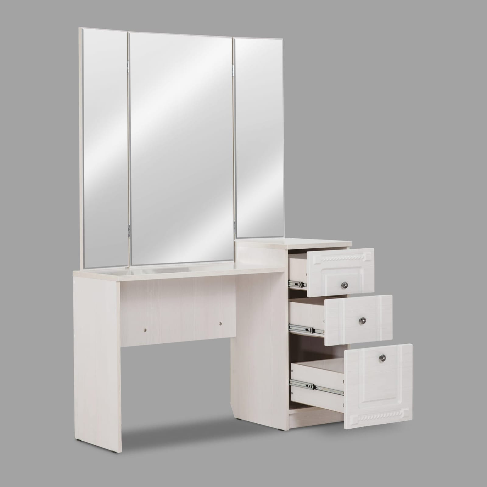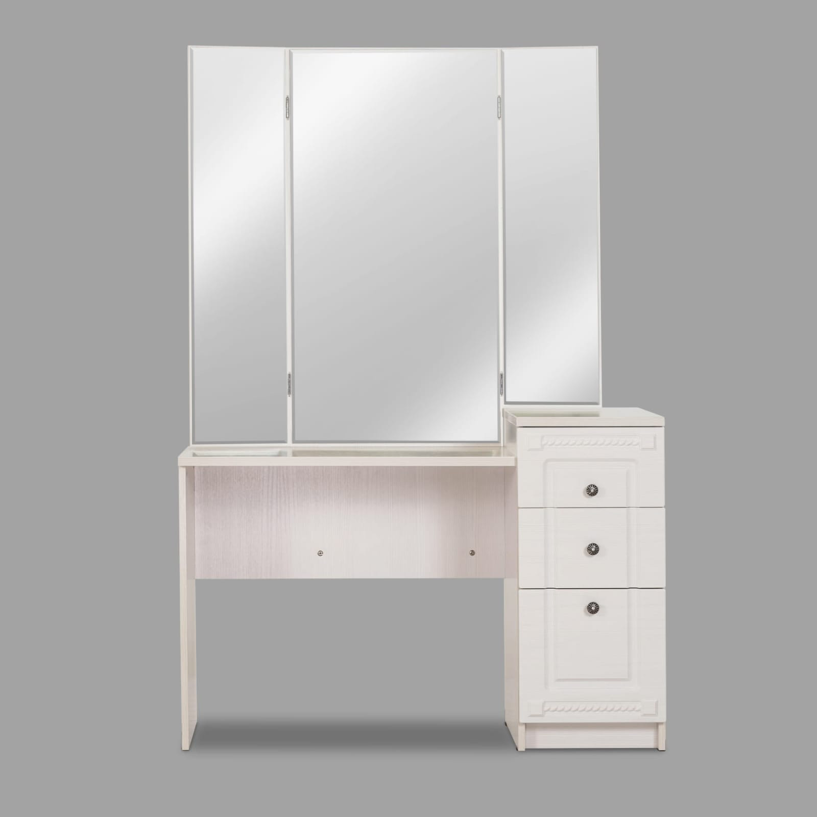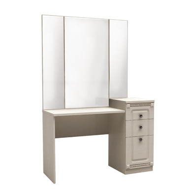 Трельяж Азалия из коллекции мебели для спальни «Азалия» оборудован трехстворчатым зеркалом и тумбой с 3 ящиками разного объема.