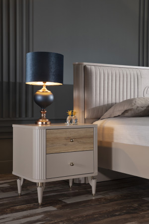 Прикроватная тумбочка Sanvito состоит из двух выдвижных ящиков и отлично сочетается с кроватью из этой же коллекции. В дизайне тумбочки присутствуют характерные черты серии Sanvito: вертикальные линии, основной кремовый цвет, деревянная вставка цвета светлый дуб, позолота в отделке элементов