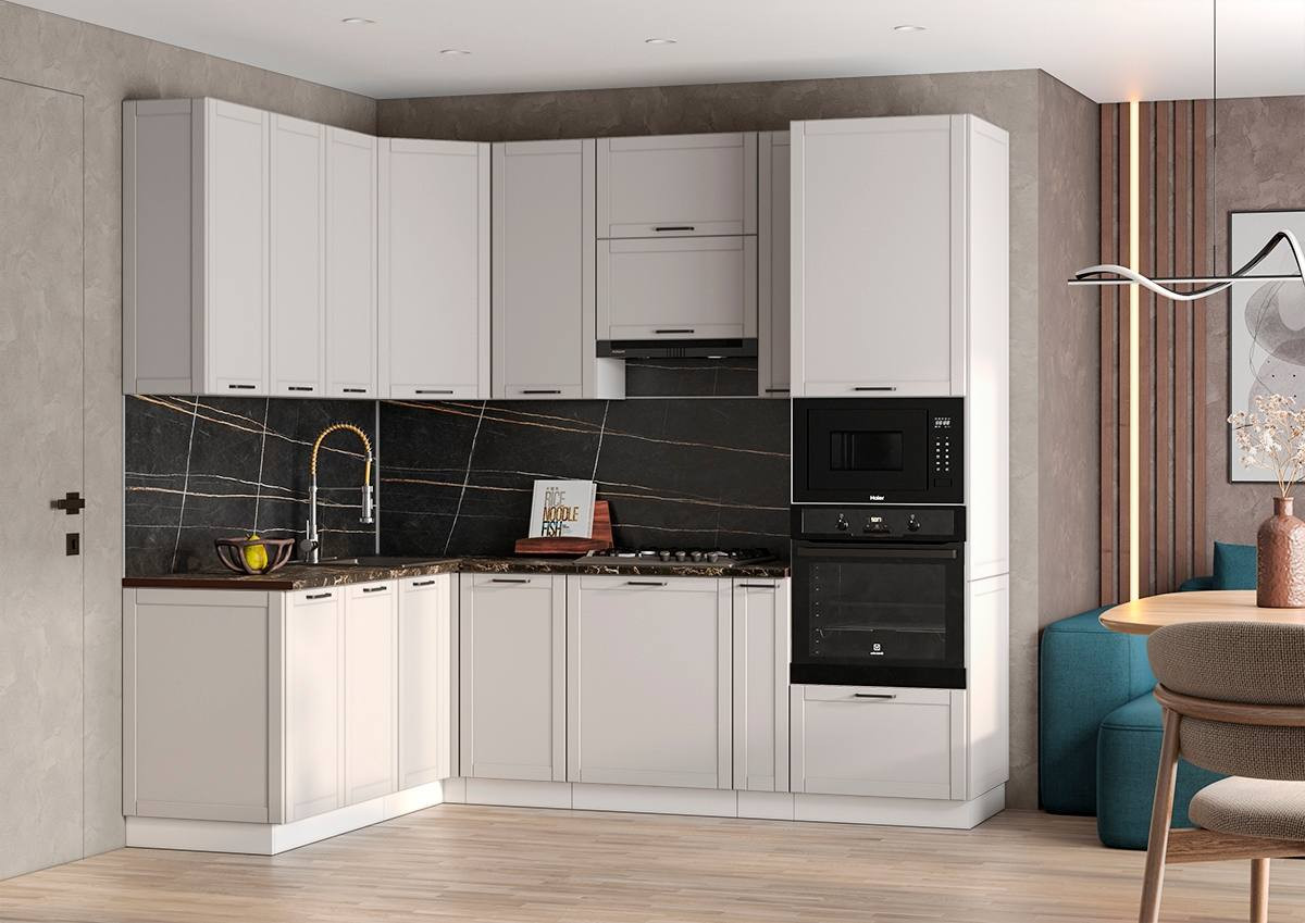 Модульная конструкция позволяет собрать гарнитур под любое пространство, а лаконичные черные ручки добавляют образу завершенности.